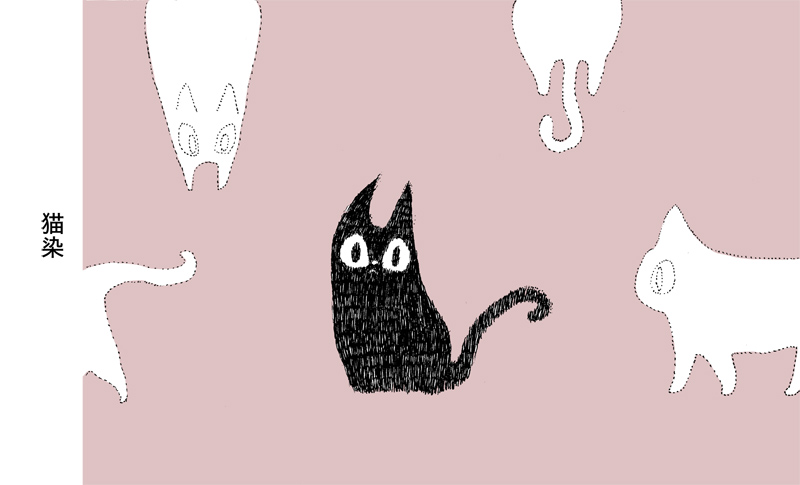 猫染(ねこ-そめ):猫の形に布や紙を染めること。また、猫に心を奪われて頭が一杯になる様子。